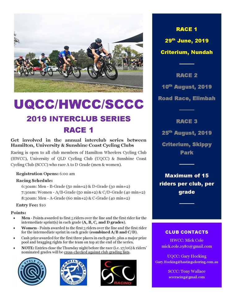 The 2019 Interclub series between Hamilton Wheelers, University of Queensland Cycling Club, and Sunshine Coast Cycling Club starts this weekend. Round One is being hosted by Uni at Nundah.Sign-on from 6:00 am. NOTE REVISED TIMES - WOMEN'S A/B will now run with Mens B grade, and Womens C/D will run with Mens D Grade